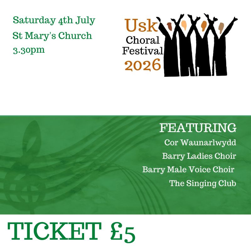 Usk Choral Festival Concert Time: 3.30pm Saturday 4th July 2026 Venue: St Mary’s Church, Usk With: Cor Waunarlwydd; Barry Ladies Choir; Barry Male Voice Choir; The Singing Club