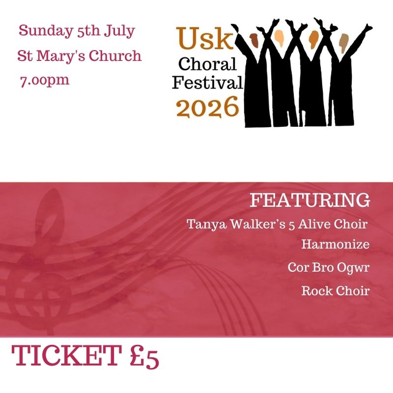 Usk Choral Festival Concert Time: 7.00pm Sunday 5th July 2026 Venue: St Mary’s Church, Usk With: Tanya Walker’s 5 Alive Choir; Harmonize; Cor Bro Ogwr; Rock Choir