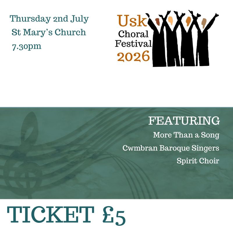 Usk Choral Festival Concert Time: 7.30pm 2nd July 2026 Venue: St Mary’s Church, Usk. With: More than a Song; Cwmbran Baroque Singers; Spirit Choir